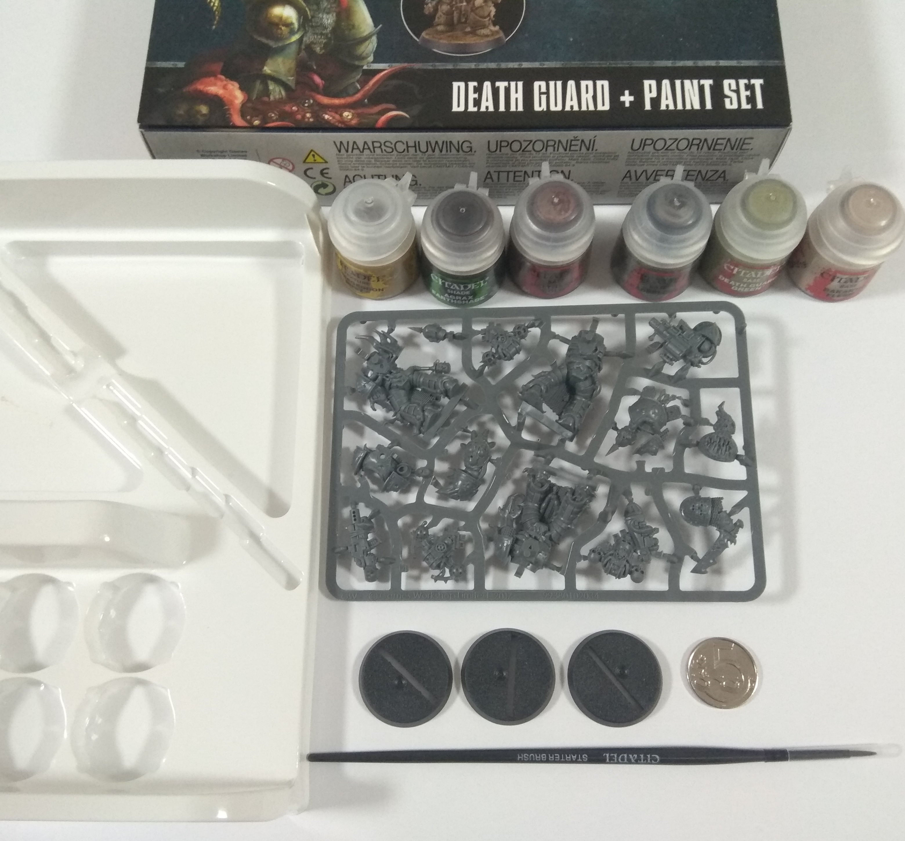 Oobsaženy sú 4 farby rady Base (Death Guard Green, Rakarth Flesh, Leadbelcher a Balthasar Gold), 1 tieňovacia atrament Shade (Agrax Earthshade) a 1 štruktúrovaná farba na podstavca Texture (Armageddon Dust).