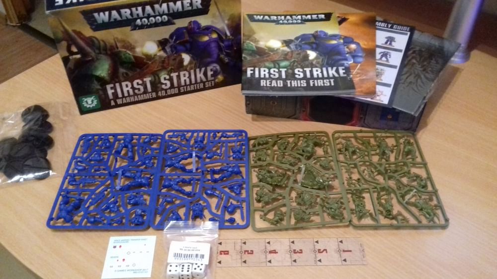 First Strike je malá štartovacia sada pre 2 hráčov a pre ľahký začiatok sa hrou Warhammer 40.000.