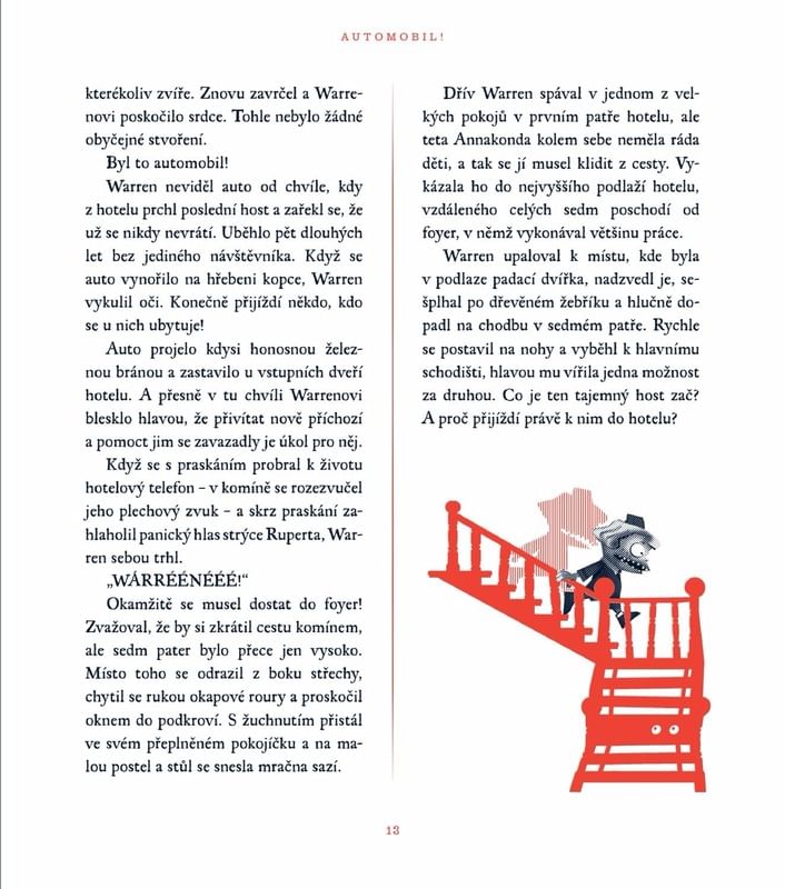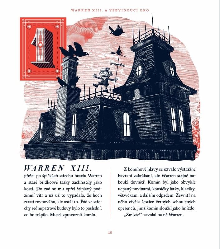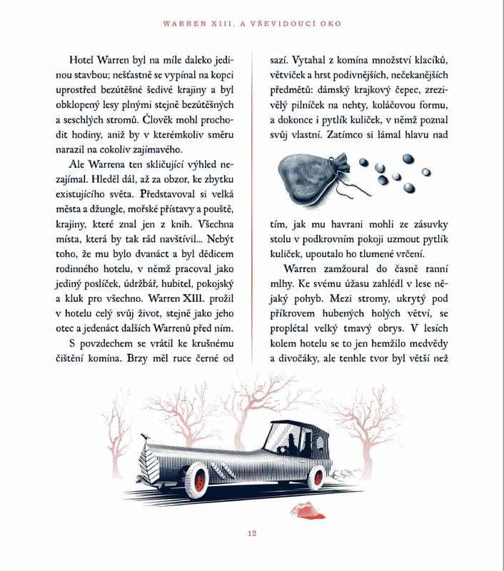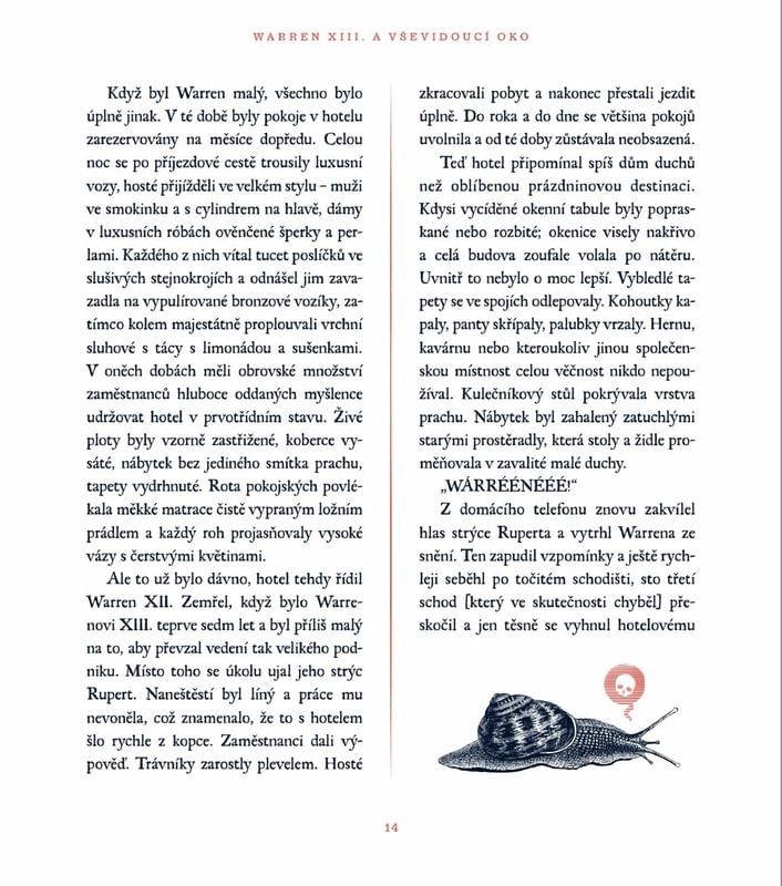 Warren XIII. a vševidoucí oko je kniha, akú ste si vždy priali mať - plná fantastických vynálezov, prekvapenie i originálnych černorudých ilustrácií, rovnako spletitých a strašidelných ako krivolaké chodbičky hotela. Jej kúzlu podľahnú nielen fanúšikovia Tima Burtona, Roalda Dahla alebo Neila Gaimana, ale všetci tí, ktorí sa radi boja a smejú súčasne.