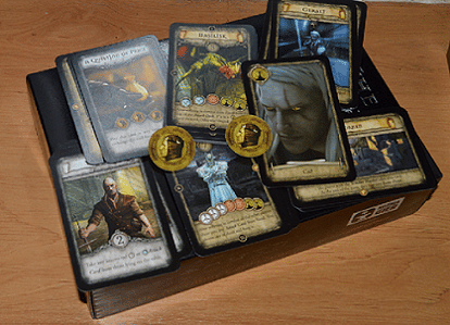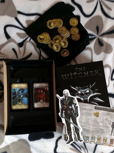 Hru tvorí 110 kariet s ilustráciami z počítačovej hry, 24 žetónov - mincí, vačok na mince, značka zaklínača a farebná pravidlá. Herné materiál je v angličtine , k dispozícii je však slovenský preklad v pdf , na požiadanie zašleme aj tlačený.