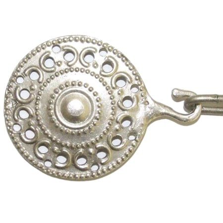 Zapínanie na plášť v antickom štýle, ozdobné kruhy s priemerom 5 cm sú spojené masívnym retiazkou dĺžky cca 8 cm.
