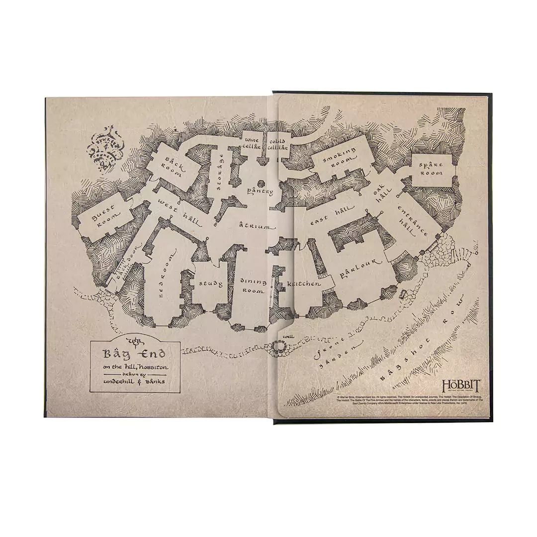 Ze všech LOTR a Hobit zápisníku snad nejkrásnější provedení. Vevnitř na deskách přilepená mapa. Na zadních deskách vevnitř kapsička a rozkreslený vnitřek Bilbova domu. Krásný, kvalitní. Klidně by se dal vystavit i ryze jako dekorace! :3