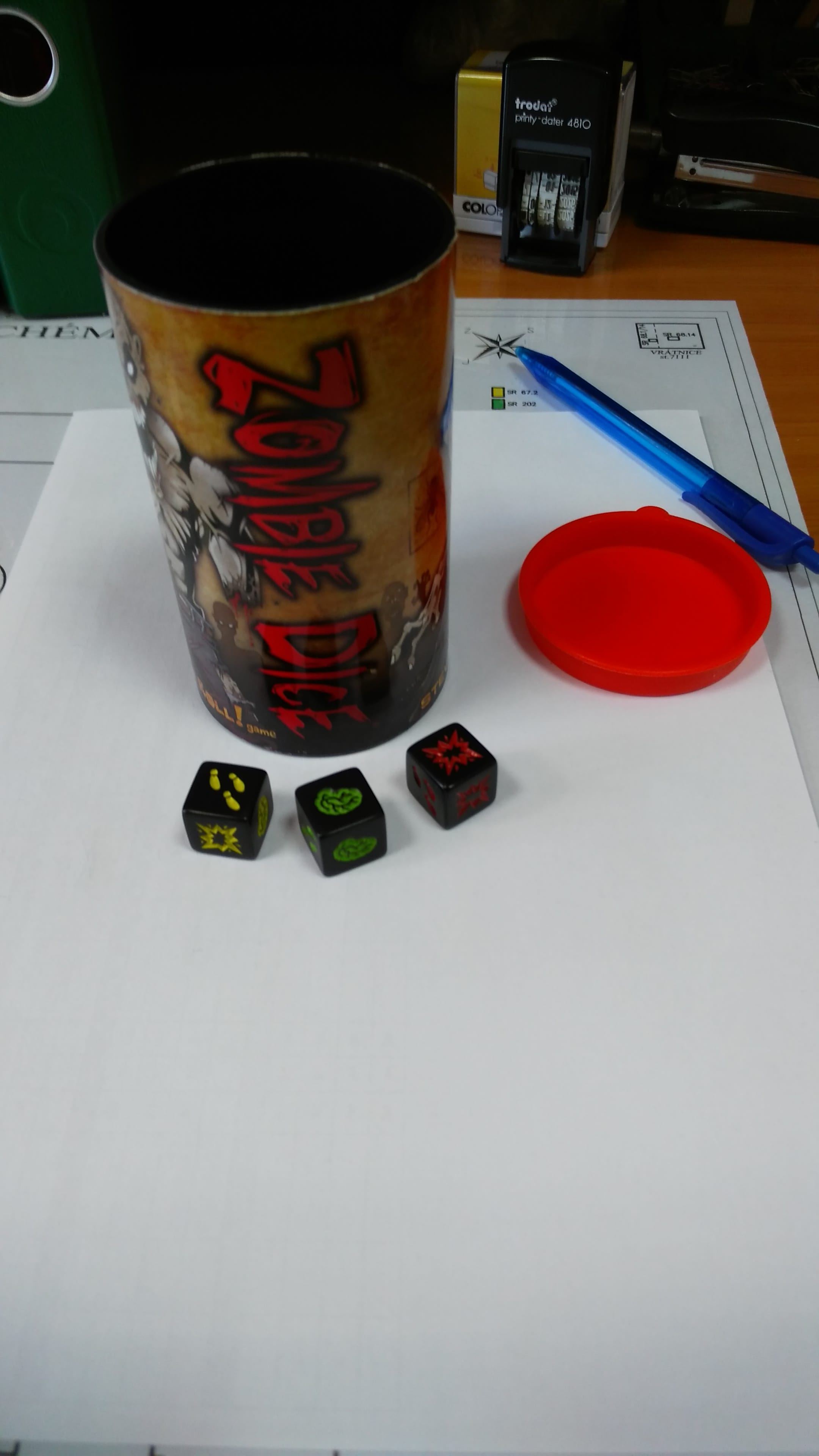 Zombie dice je dobrá, snadno vysvětlitelná kostková rychlovka, kterou zvládnou i děti od 6 let. Hra se skládá pouze z kalíšku a 13 kostek, jejichž barevnost rozlišuje jejich obtížnost (6x jednoduchá zelená, 4x středně obtížná žlutá a 3x těžká červená).