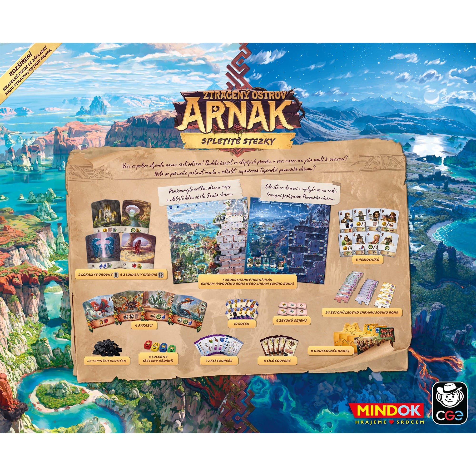 Priprav sa na konečnú výpravu do sveta Ztraceného ostrova Arnak! Doteraz najväčšie rozšírenie Pletená cesta ti prináša obojstrannú hernú plochu, väčšiu ako základná hra, s dvoma úplne novými prieskumnými cestami a jedinečnými mechanikami. Vstúpte do chrámov, aké ste ešte nevideli, a odhaľte nové tajomstvá!